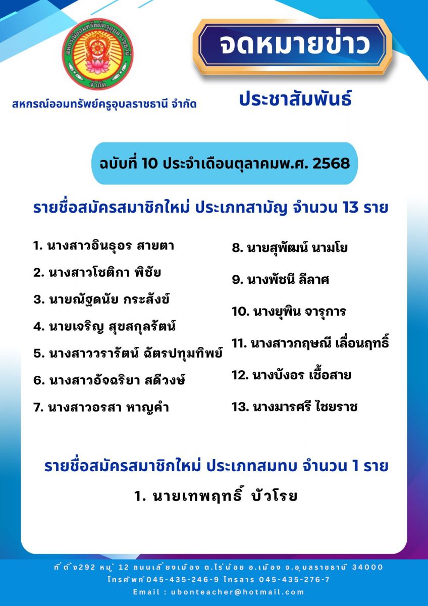 รายชื่อสมาชิกใหม่ ประจำเดือนตุลาคม 2568
