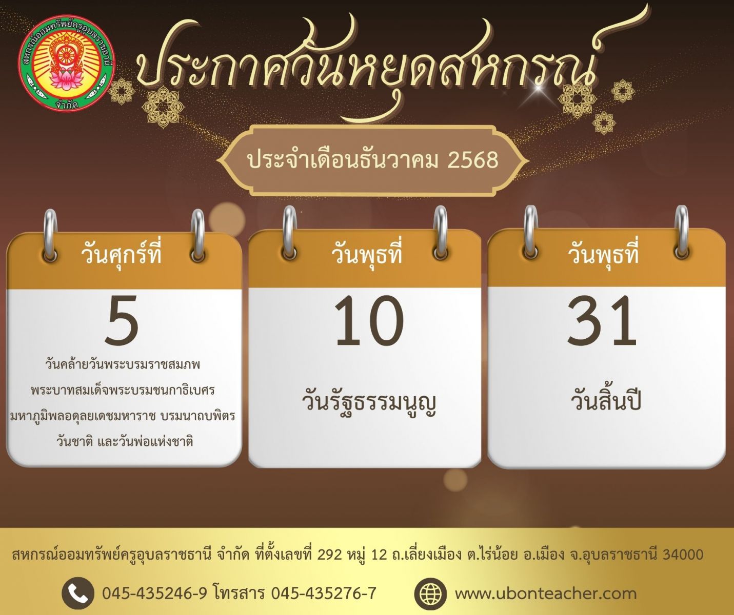 ประกาศวันหยุดสหกรณ์ ประจำเดือนธันวาคม 2568