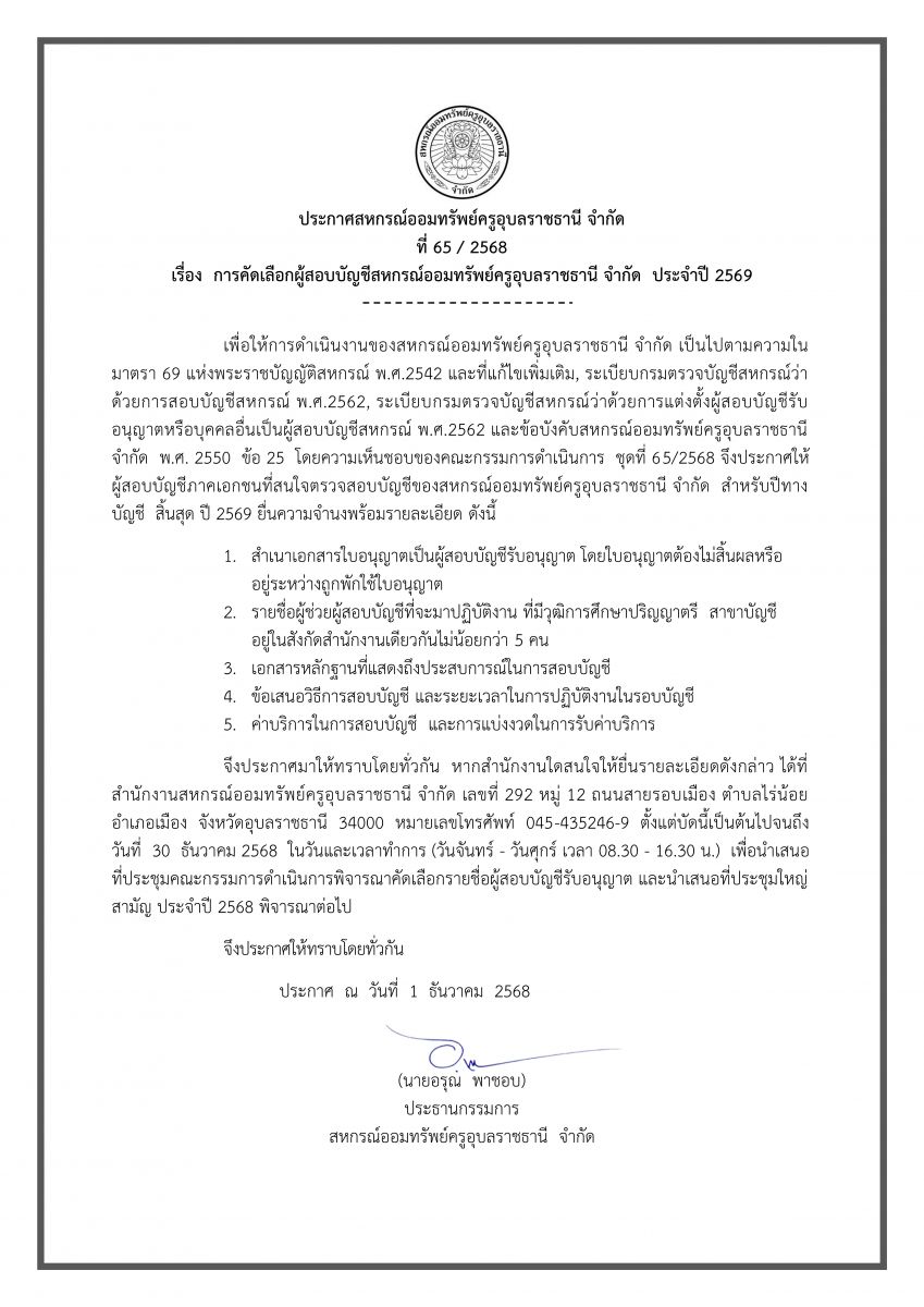 ประกาศสหกรณ์ฯ เรื่อง การคัดเลือกผู้สอบบัญชีสหกรณ์ออมทรัพย์ครูอุบลราชธานี จำกัด ประจำปี 2569