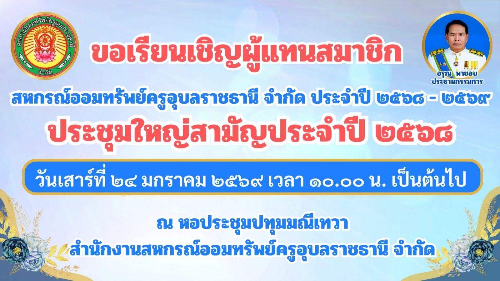 ขอเรียนเชิญผู้แทนสมาชิกสหกรณ์ฯ ประจำปี 2568-2569 ประชุมใหญ่สามัญประจำปี 2568